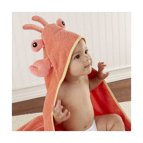Adorably designed, coral, terrycloth hooded towel with 3-D lobster head, claws and tail