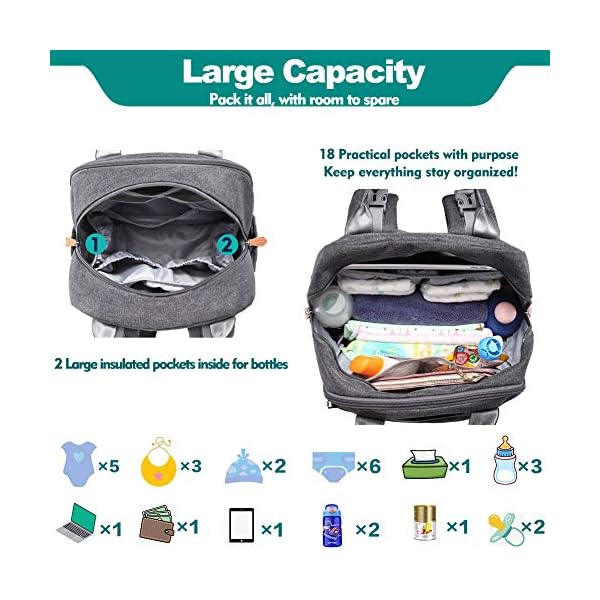 What You’ll Get – A spacious enough diaper backpack (size: 12″x8″x16.5″, 26L), an easy wipe-clean foldable changing mat (size: 23”x14.5″), features stroller straps, and a detachable pacifier holder. The baby diaper bag comes with everything you need when on-the-go, to hold everything for baby plus some for you.